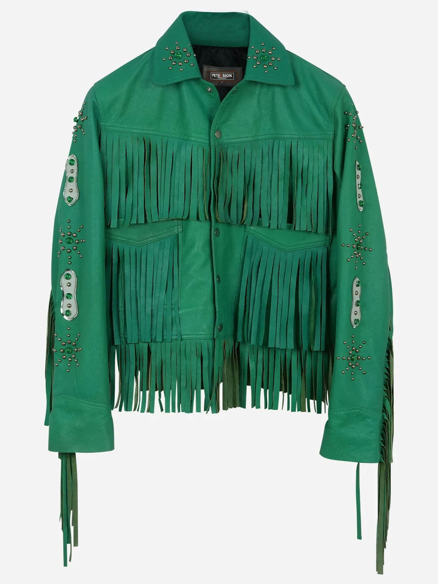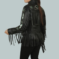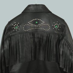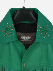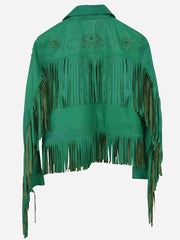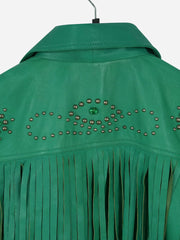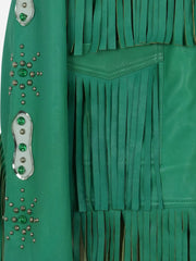 Women Cowgirl Classic Western Style Green Fringe Leather Jacket