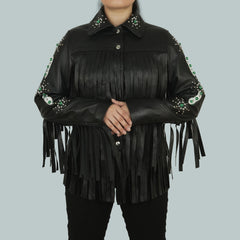 Petersign takes pride in launching this stunning fringe leather jacket to enhance your overall style like never before. This cowgirl fringe jacket is made with real leather which is so comfortable and breathable to wear for a long time during chilly hours. Manufactured to update your style, this cowgirl leather jacket features a beautiful adorned shirt style collar with adorned full-length fringe style sleeves. For a snug fit, we have designed a buttoned closure on the front which provides a very tailored look around the chest and shoulders. This cowgirl jacket with fringe is easily pairable with multiple basic clothing items like jeans, shorts, and skirts as well. We have designed this fringe cowgirl jacket while keeping the factor of warmth and stylishness in mind. So, wearing it is definitely going to get you a lot of compliments. Order this vintage fringe leather jacket today to get at discounted prices!