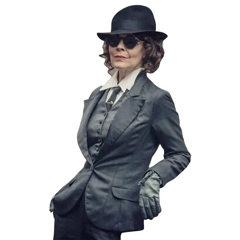 Helen McCrory TV Series Peaky Blinders Aunt Polly S06 Suiting Fabric Three Piece Grey SuitProduct Specifications: Material: Suiting Fabric Internal: Viscose Lining Front: Button Closure Collar: Notch Lapel Style Collar Cuffs: Button Cuffs Sleeves: Full-Length Pockets: Two Outer Pockets Color: Grey Vest Specifications: Material: Suiting Fabric Sleeves: Sleeveless Closure: Buttoned...