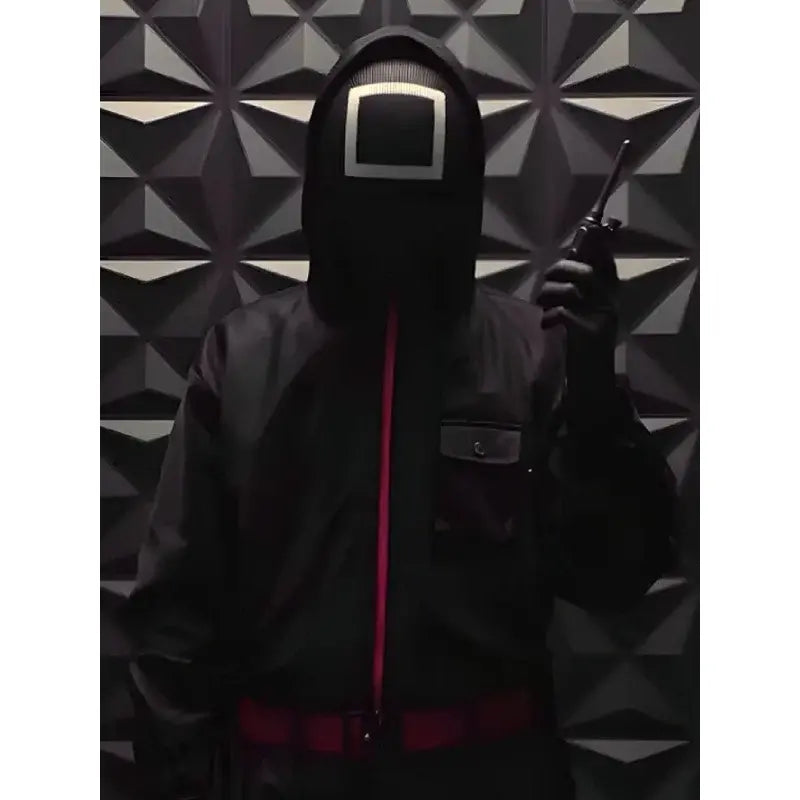 Squid Game Season 3 Manager Pink Zipper Black Hooded Jumpsuit Specification:   • This Is A Recreated Product   • Material: Cotton, Polyester   • Inner: Soft Viscose Lining   • Front: Zipper Style Closure   • Collar: Hooded Collar   • Sleeves: Full-Length Sleeves   • Cuffs: Elastic Cuffs   • Color: Black   • Pockets: One Left...