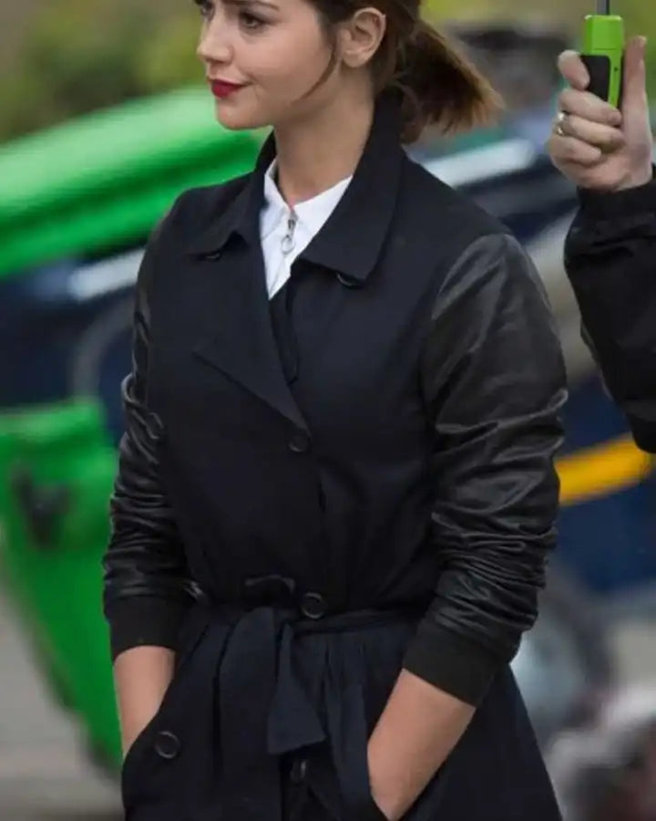 Channel the timeless elegance of Jenna Coleman’s character with the Clara Oswald Doctor Who Coat. Crafted from a premium wool blend with a soft viscose lining, this sophisticated black coat features sleek leather sleeves that add a bold contrast. The rib-knit cuffs provide added warmth and style, while the double-breasted front with a waist belt ensures a flattering fit. Perfect for fans and fashion enthusiasts alike, this coat blends classic tailoring with a modern edge.