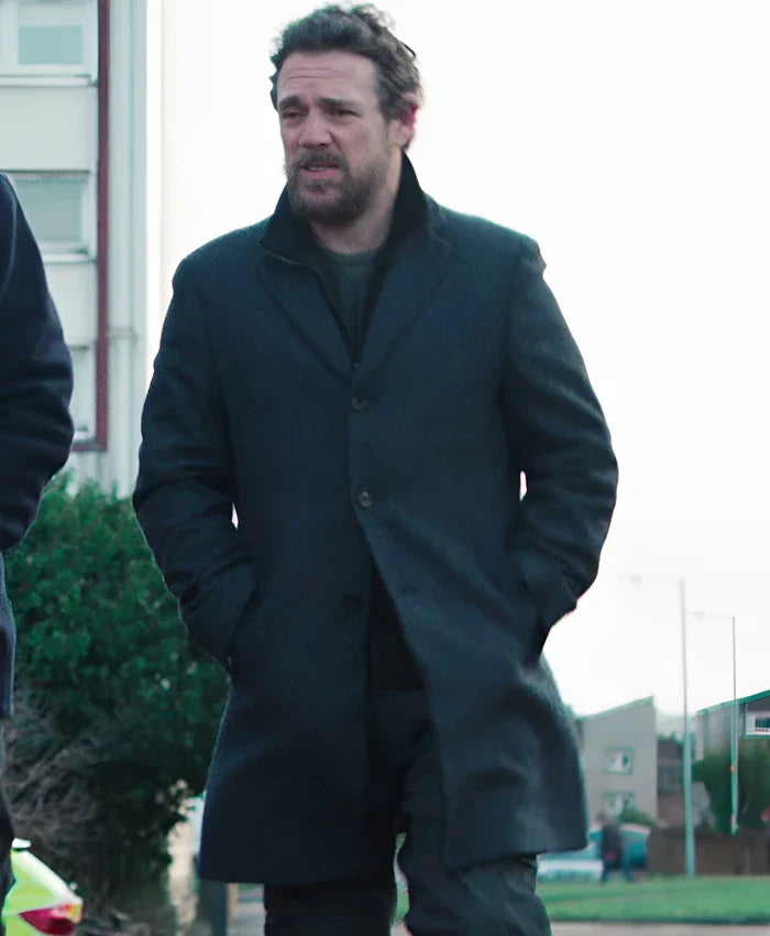 This classic black wool coat is inspired by Jamie Sives in *Dept. Q* Season 1. Crafted from high-quality wool fabric with a smooth viscose lining, it features a stylish lapel collar and full-length sleeves. Designed with two side and two inner pockets, open hem cuffs, and a buttoned closure, this coat combines sophistication with comfort.
