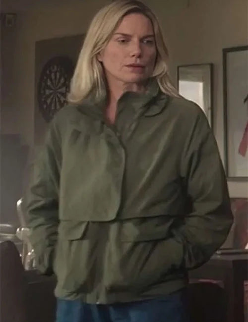 Shop Eva Garvey's green cotton polyester jacket from Bad Sisters Season 02, worn by Sharon Horgan. This jacket features a stand-up collar, YKK zipper closure, and multiple pockets for a stylish and functional look.