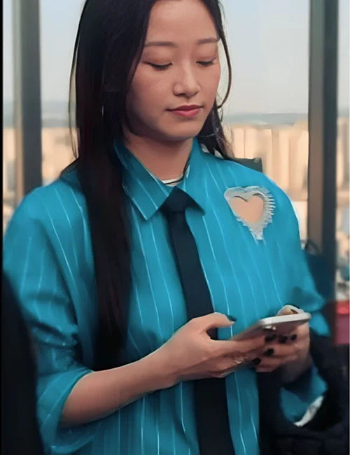 Make a bold statement with the Gia Kim blue striped heart cut-out shirt from the TV series XO, Kitty Season 02. Designed with a cotton fabric, it features a unique heart cut-out detail, a classic shirt-style collar, and full-length sleeves. Elevate your casual wardrobe with this standout piece.