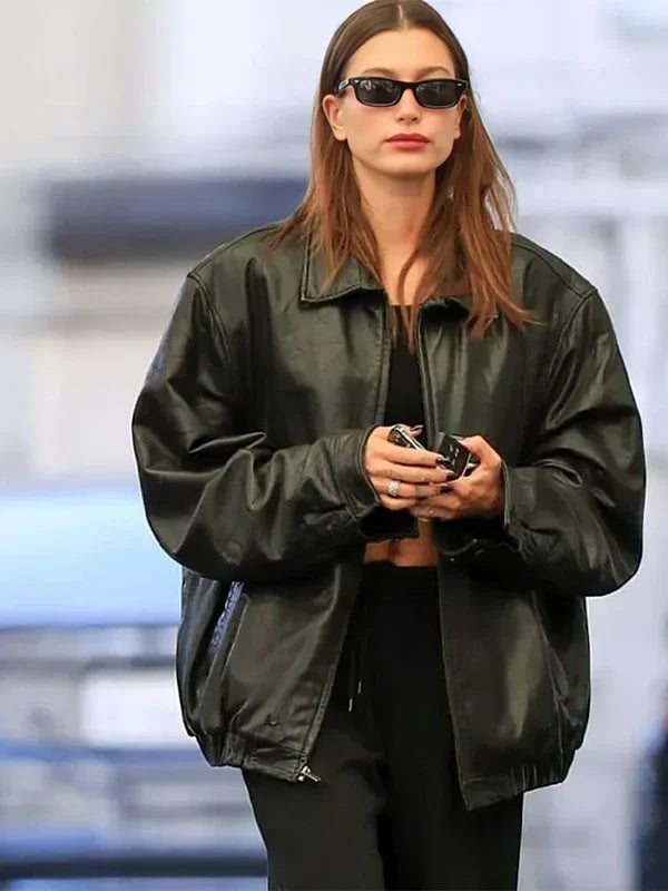 Hailey Bieber Oversized Leather Jacket Channel Hailey Bieber's effortlessly chic style with this oversized leather jacket. Crafted from premium real leather with a soft viscose lining, this jacket features a relaxed fit, a classic shirt-style collar, and a sturdy zipper closure. Its deep green hue adds a bold yet versatile...