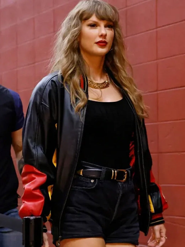 Kansas City Chiefs Taylor Swift Varsity Jacket Support the Kansas City Chiefs in style with the Taylor Swift Black Bomber Jacket. Made from premium real leather, this black varsity jacket features a ribbed collar, zipper closure, and ribbed cuffs, combining sporty vibes with elegant design. Specifications: Inspired by: Taylor Swift...