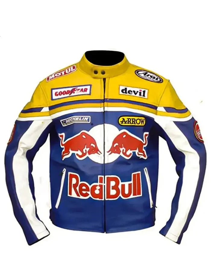 Buy Lillie Red Bull Motorcycle Blue and Yellow Full Zipper Leather Jacket. Designed for motorcycle enthusiasts, this jacket features bold colors and a stylish fit with a zipper closure.