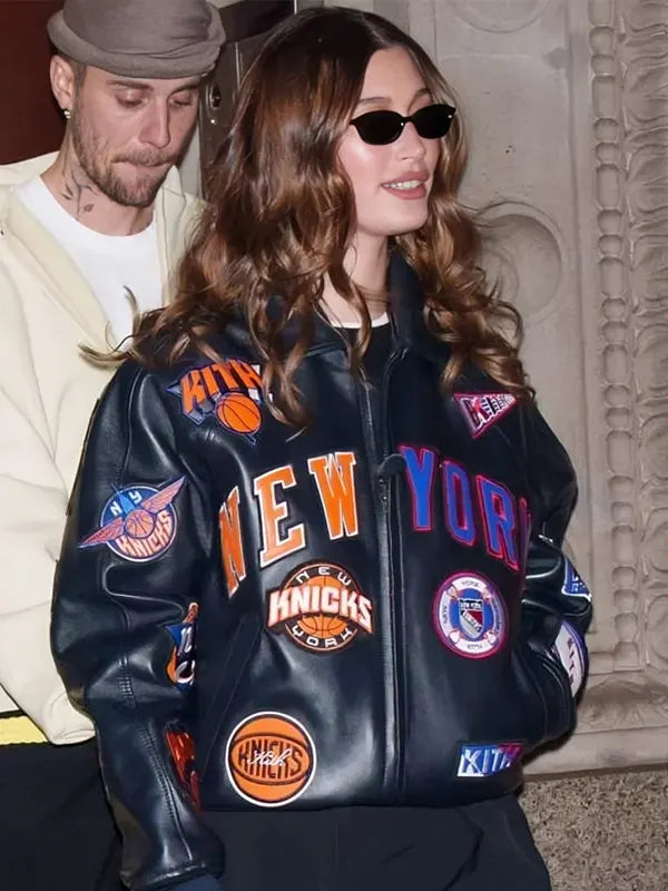 New York Knicks Hailey Bieber Black Leather Bomber Jacket