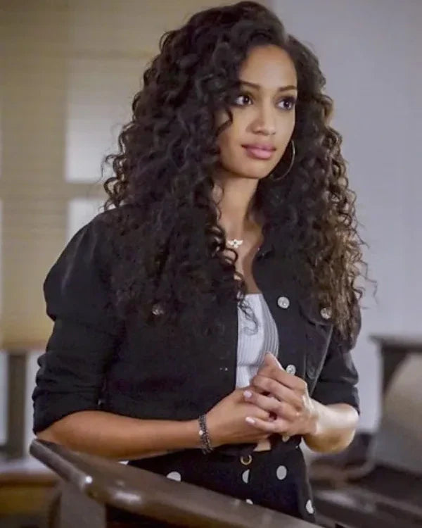 Get a stylish look with the *Olivia Baker Black Cropped Jacket* from the TV series *All American*. This chic jacket, worn by Samantha Logan, is crafted from soft cotton fabric with a shirt collar, buttoned cuffs, and a buttoned closure for a perfect fit. Ideal for adding a trendy twist to your casual outfits, this cropped jacket is a must-have for fashion-forward individuals.