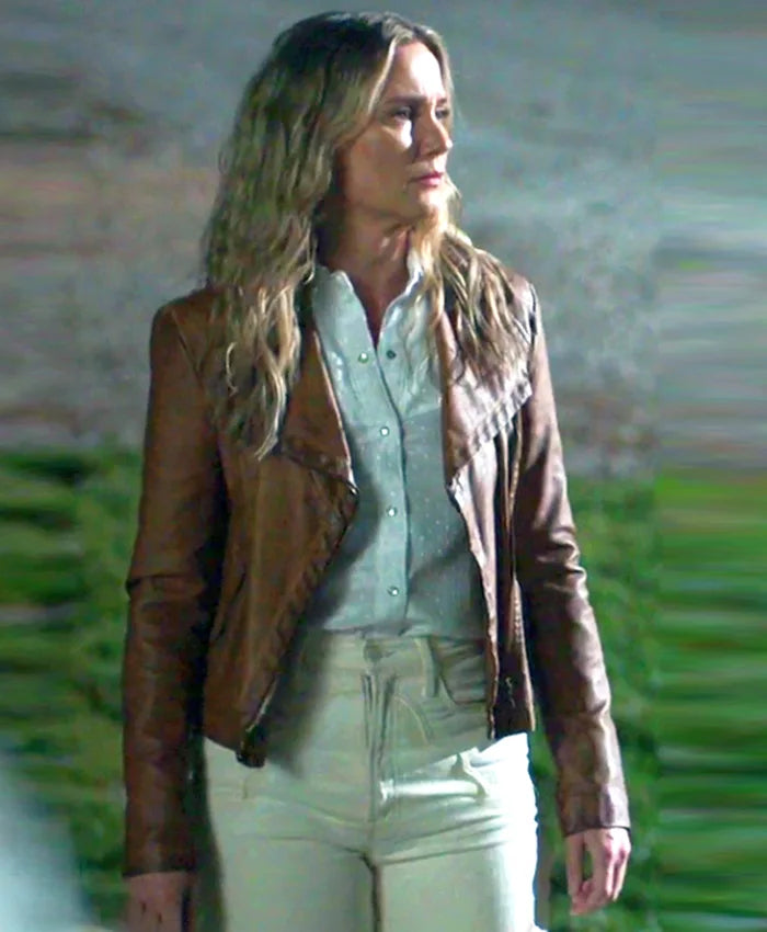 Inspired by Jennifer Nettles’ character Maryanne Dice in *The Bondsman* Season 1, this brown leather jacket combines rugged style with refined details. Crafted from genuine leather with a smooth viscose lining, it offers comfort and durability. Features include a lapel style collar, full-length sleeves with zipper cuffs, and a secure zipper closure. The jacket also has two side and two inner pockets for practicality.