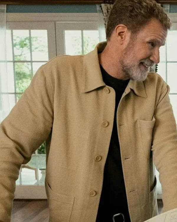 Inspired by Will Ferrell's character Jim in the movie *You're Cordially Invited (2025)*, this beige jacket exudes timeless sophistication. Crafted from high-quality wool fabric, it offers a comfortable fit with its viscose lining, shirt-style collar, and buttoned closure.