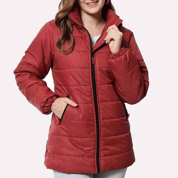 This Women's Long Duffel Puffer Jacket offers a relaxed fit with soft nylon fabric, making it an ideal choice for warmth and comfort. Featuring full sleeves, a solid pattern, and a convenient zip closure, it's perfect for cold weather.
