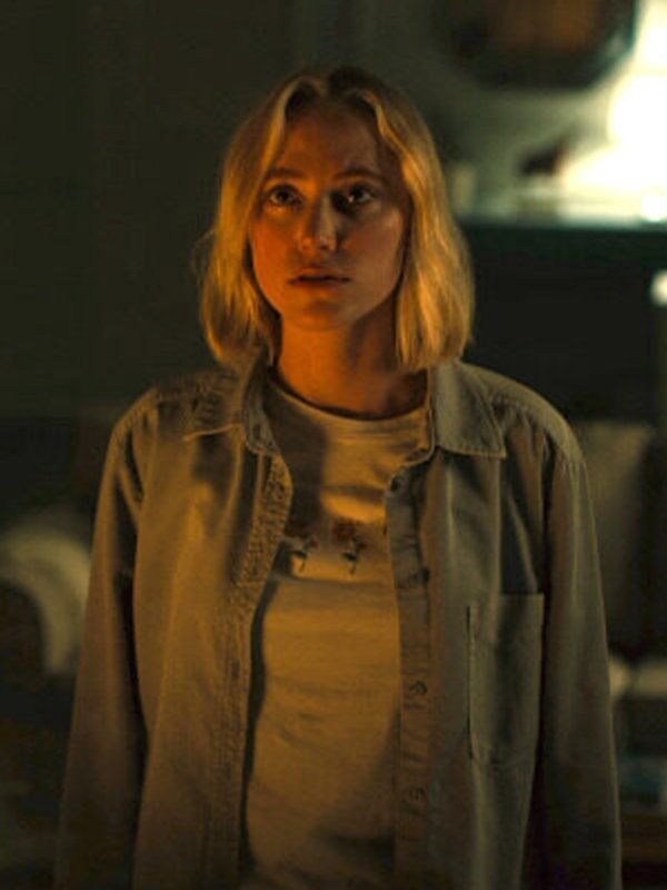 Maika Monroe Watcher 2022 Julia Cotton Jacket Product Specifications: Material: Cotton Internal: Viscose Lining Collar: Shirt Style Collar Front: Buttoned Closure Sleeves: Long Sleeves Cuffs: Buttoned Cuffs Pockets: One Chest, One Inner & Two Side Waist Pockets Color: Grey