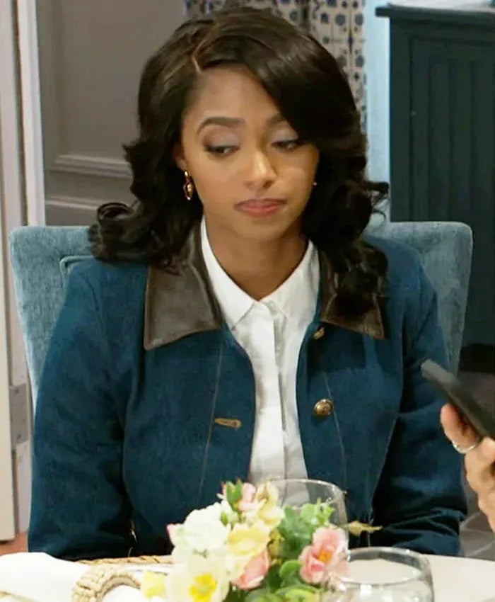 Make a bold fashion statement with the blue denim jacket inspired by Colby Muhammad’s character Kat Richardson in *Beyond the Gates* Season 1. This versatile jacket features durable denim fabric paired with a unique shirt-style leather collar for added edge. Its comfortable viscose lining, full-length sleeves, and buttoned front closure create a classic yet contemporary look that fits seamlessly into any wardrobe.