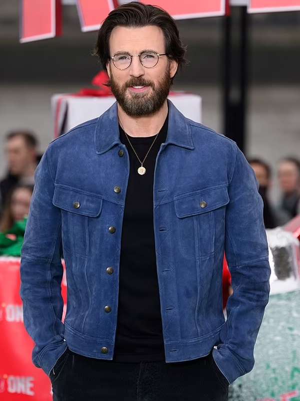Red One Movie Premiere 2024 Chris Evans Blue Suede Leather Jacket