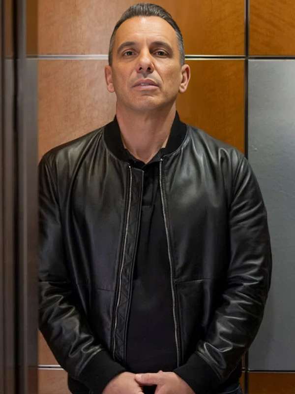 This stylish black bomber jacket, inspired by Sebastian Maniscalco's character in *Bookie* S01, combines a sleek real leather exterior with a ribbed collar and full-length sleeves, offering both comfort and sophistication.