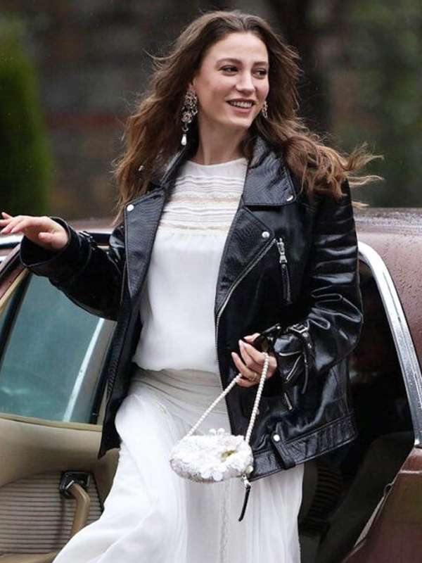 Embrace the edgy style of Devin Akin, portrayed by Serenay Sarikaya in *Aile* (The Family), with this sleek Black Biker Leather Jacket.