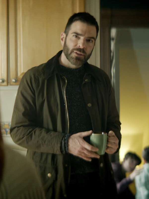 Inspired by Zachary Quinto's portrayal of Dr. Oliver Wolf in *Brilliant Minds 2024*, this green cotton jacket features a versatile design with a combination of zipper and buttoned closure, a shirt-style collar, and ample pockets for both style and practicality.