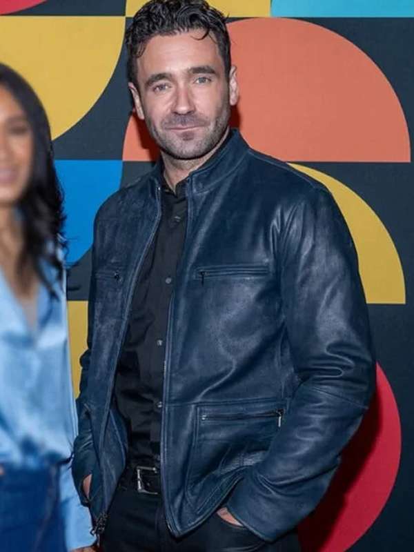 This black leather jacket, inspired by Allan Hawco in *Saint-Pierre 2025*, exudes style and sophistication. Made from premium real leather with a viscose lining, it features a stand-up collar and a sleek zipper closure. Designed with practicality in mind, it includes multiple pockets for convenience, along with full-length sleeves for a polished look.