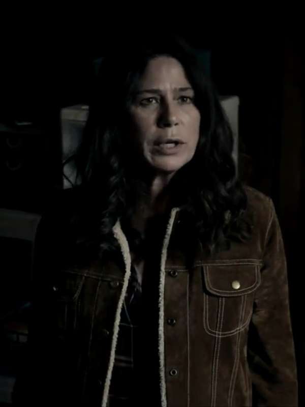 Inspired by Maura Tierney as Grace Poe in "American Rust," this brown shearling jacket is crafted from soft suede fabric with a faux shearling lining for warmth and style.