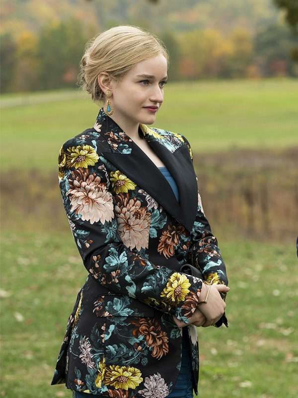 Step into the world of fashion with Julia Garner's floral coat from *Inventing Anna*. This stylish piece is made from cotton fabric with a lapel collar.