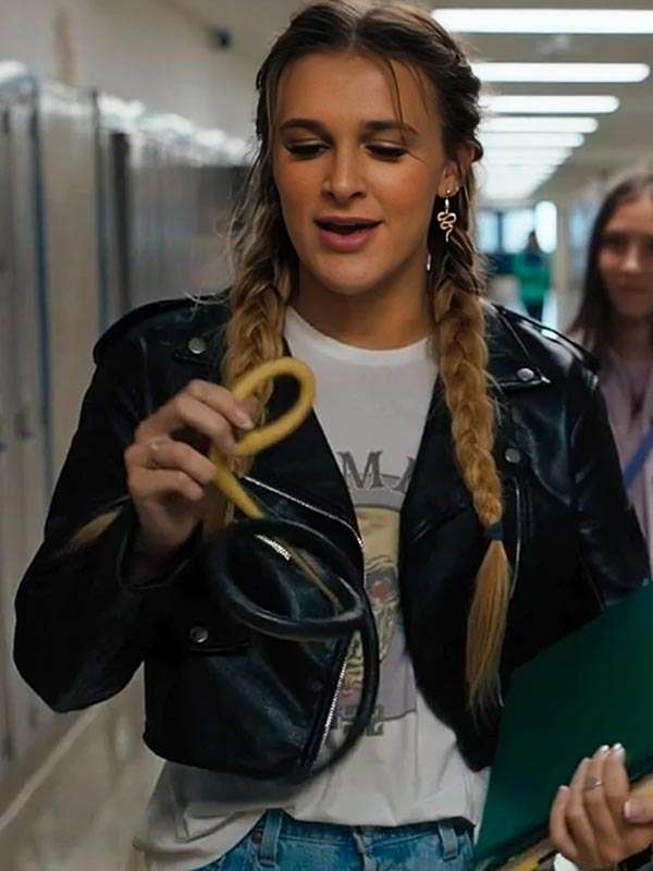 Inspired by Madi Monroe’s appearance as Amy Maxwell in *Zombie Town*, this black cropped leather jacket exudes modern edge with a classic biker twist. Crafted from real leather and lined with soft viscose, it features a sleek zipper front, lapel collar, and ample pockets for both style and function. A must-have piece for fans or street-style enthusiasts.