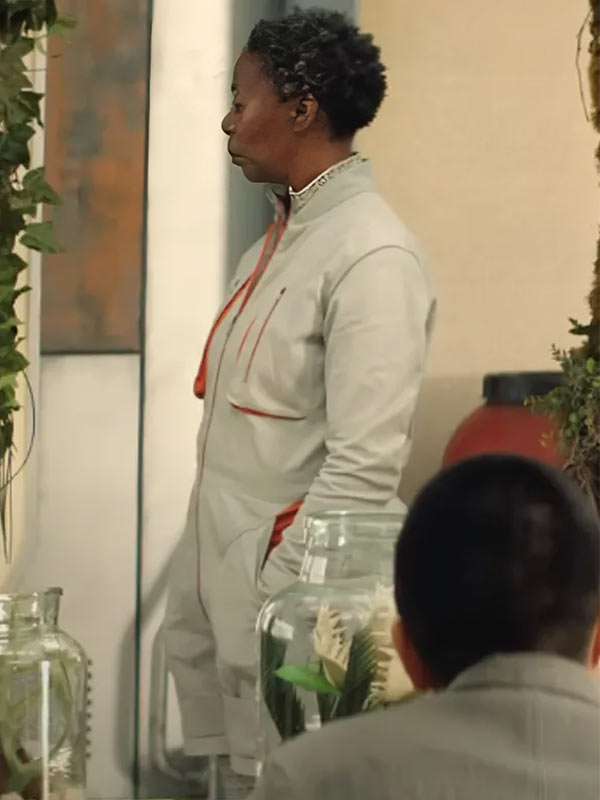 Inspired by Noma Dumezweni’s character Mensah from Murderbot Season 1, this off-white jumpsuit is made from quality fabric with a viscose lining for comfort. It features a zipper closure, an erect collar, full-length sleeves, and multiple pockets including four outside and one inside for convenience and style.