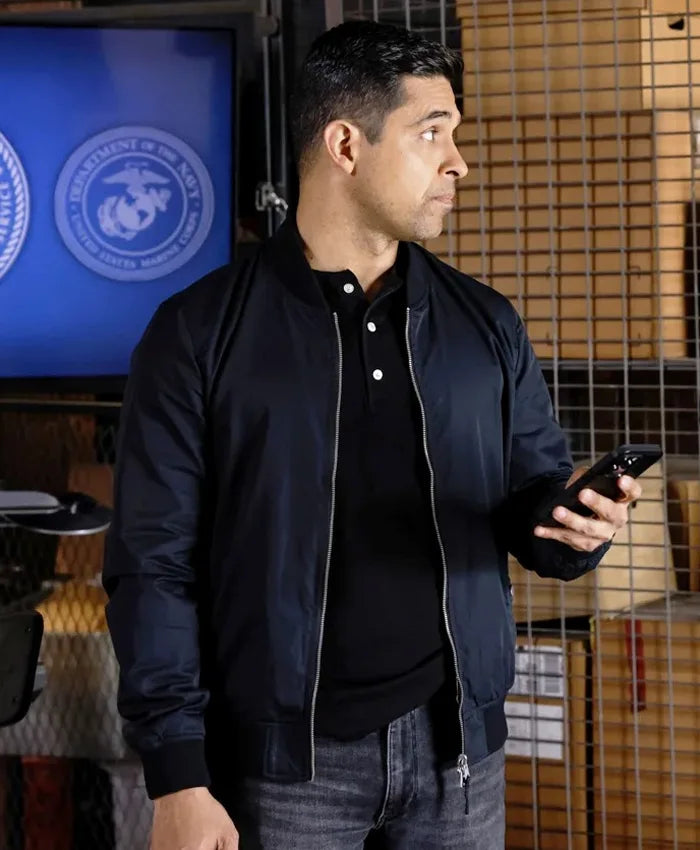 Elevate your outerwear with the iconic blue bomber jacket worn by Wilmer Valderrama as Nick Torres in *NCIS* Season 22. Made from high-quality satin fabric, this jacket features a soft viscose lining for added comfort and a polished finish. The rib-knitted collar, cuffs, and hemline enhance its sporty look, while the zip-up front and practical pockets offer both function and fashion. Perfect for fans and style-savvy individuals alike.