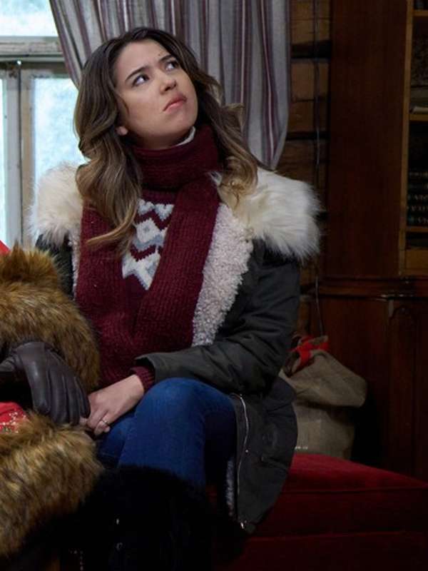 Embrace warmth and elegance with the green shearling jacket inspired by Nichole Sakura's role as Elyse in *The Finnish Line 2024*. This stylish jacket is crafted from high-quality fabric, complemented by a faux shearling lining and a cozy hooded fur collar.