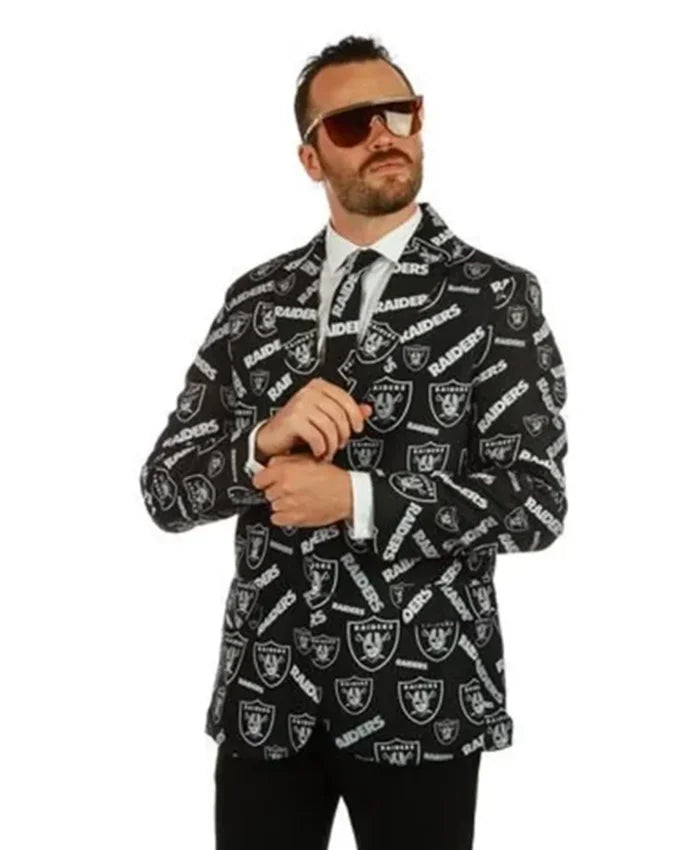 Oakland Raiders Suit Show your Raiders pride with the Oakland Raiders Suit, available for both men and women. This suit features a stylish jacket with a lapel collar, open-hem cuffs, and buttoned front closure. The matching pants come in a sleek black and white color combo, making it perfect for...
