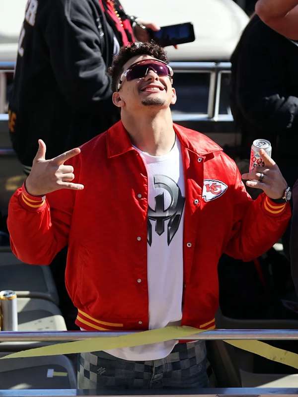 Celebrate the Kansas City Chiefs' victory with the Patrick Mahomes Red Satin Bomber Jacket. This jacket, inspired by the Super Bowl Parade 2024, features satin fabric, a buttoned closure, and ribbed cuffs, perfect for showing off your team pride.