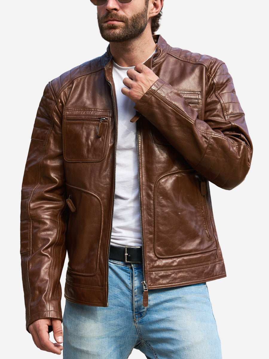 Men’s Brown Leather Jacket With Band CollarThis Men's Brown Leather Jacket features a slee...$182.00