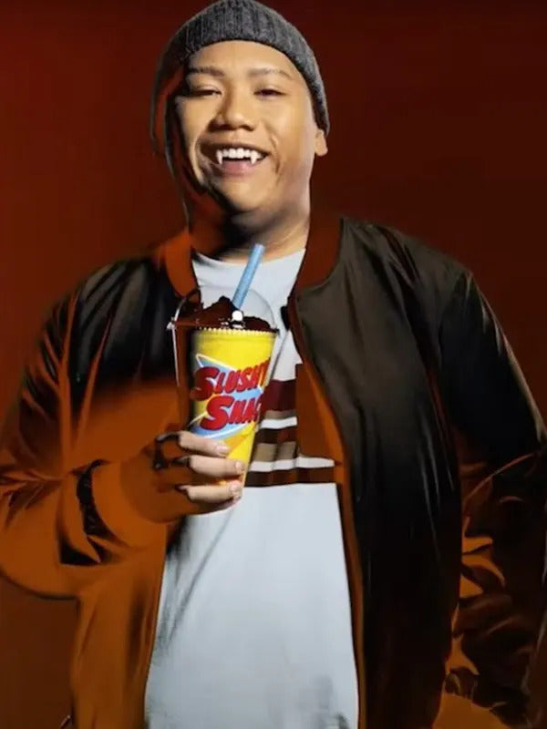 Jacob Batalon Reginald the Vampire 2022 Reginald Baskin Brown Bomber JacketSPECIFICATIONS Material: Satin Fabric Inner: Viscose Lining Closure: Zipper Closure Collar: Rib Knitted Collar Cuffs: Rib Knitted Cuffs Color: Brown