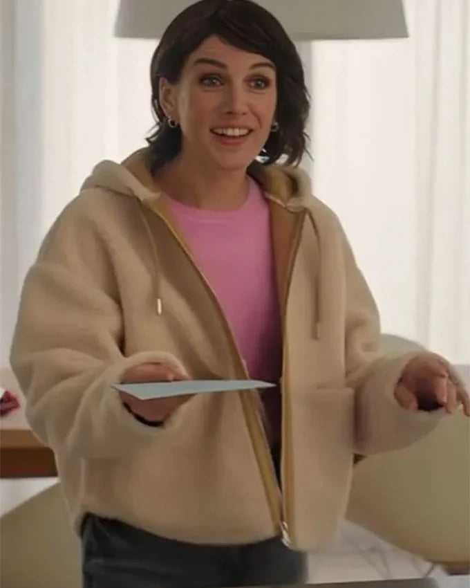 Buy Fiona Movie Love Of The Irish 2025 Shenae Grimes Off White Sherpa Hooded Jacket. A cozy and stylish hooded jacket made from soft Sherpa fabric, perfect for casual wear and comfort.