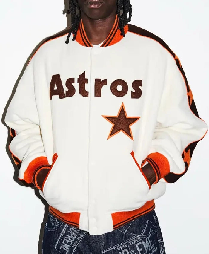 Upgrade your streetwear collection with the Supreme SS26 Astro Houston Varsity Jacket. Crafted from premium wool fabric, this off-white jacket delivers warmth, durability, and standout style. The soft viscose lining ensures smooth comfort for everyday wear, while the classic snap-tab button closure enhances its traditional varsity appeal. Designed with full-length sleeves, rib knitted collar, and rib knitted cuffs, it offers a secure and structured fit. With practical outside and inside pockets, this unisex varsity jacket blends functionality with iconic fashion, making it a must-have statement piece for any season.