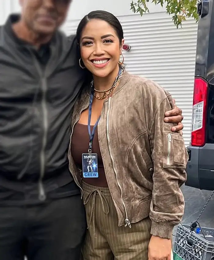 Inspired by Anthea Neri’s role as a tour manager in *SWAT* Season 8, this brown bomber jacket delivers effortless style with a timeless silhouette. Crafted from premium suede leather and lined with soft viscose, it ensures warmth and comfort. The rib-knitted collar, cuffs, and hemline offer a snug fit and classic bomber appeal. Finished with a front zipper closure and practical pockets inside and out, this jacket is ideal for casual wear or layering during cooler days.