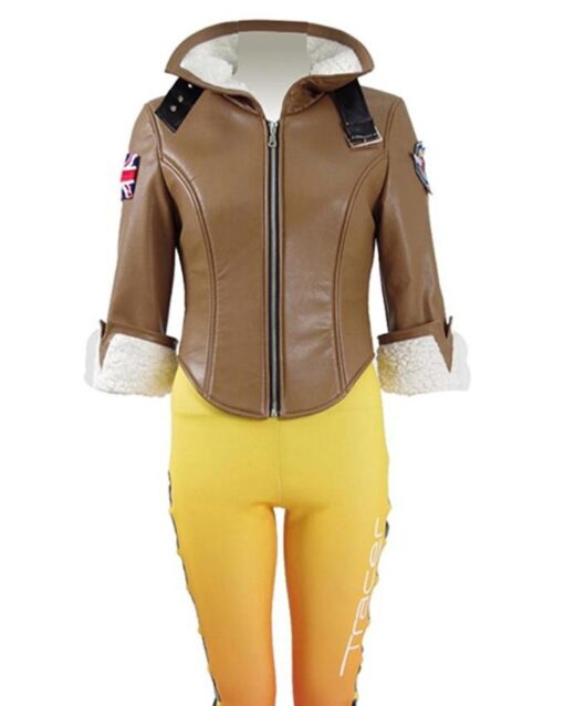 Overwatch Tracer Shearling Brown Leather JacketProduct Specification: External: Real Leather / Faux Leather Internal: Viscose Lining Closure: Front Zip Closure Collar: Stand-up Collar Pockets: Two Inside Pockets Cuffs: Open Hem Cuffs