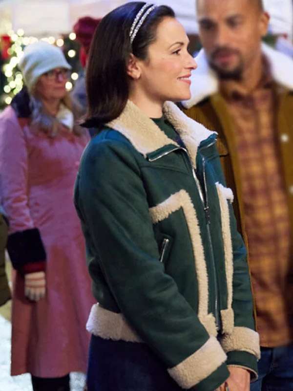 Inspired by Italia Ricci’s character Michelle in *Trading Up Christmas* 2024, this green shearling jacket combines warmth and style, featuring faux shearling lining and a cozy shearling collar.