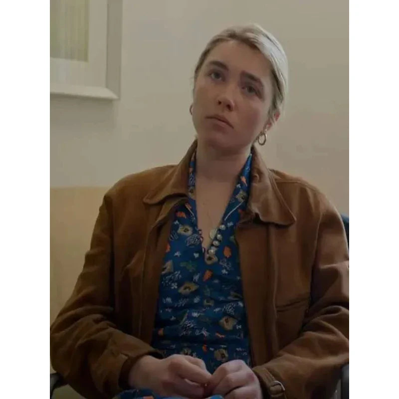 We Live in Time Florence Almut Brown Jacket Specification:    • This Is A Recreated Product    • Material: Suede Leather    • Inner Lining: Viscose Lining    • Front: Zipper Closure    • Collar: Shirt Style Collar    • Color: Brown    • Pockets: Three at Front and One...