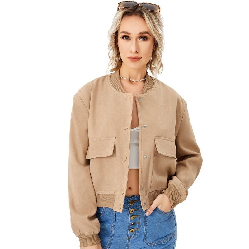 Women's Lightweight Cropped Bomber Jacket This Women's Lightweight Cropped Bomber Jacket is designed with wool material for warmth and comfort, full-length sleeves for coverage, and rib-knitted cuffs for a snug fit. The drop-down collar and front button closure add a touch of style, while the two outside pockets provide convenient...